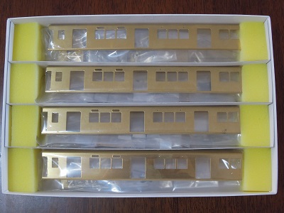 キット内容 ・中間車4両。 先頭車同様に折曲済の側面〜屋根に妻板を組合わせる 構造です。 |
