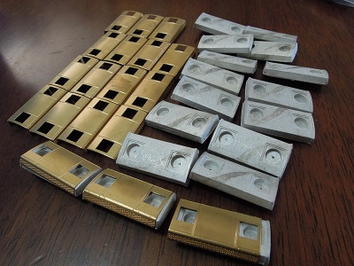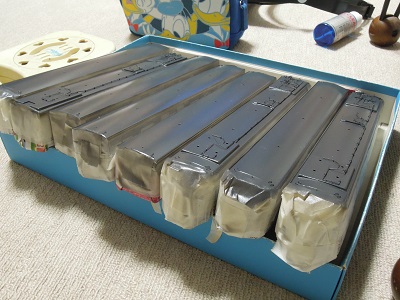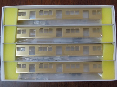 キット内容 ・こちらは先頭車4両。 折曲済の側面〜屋根に妻板と、プレスされた先頭部を 組合わせる一般的な構造です。 クーラーとベンチレータはホワイトメタル、その他はロスト ワックス製になっています。 |