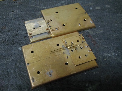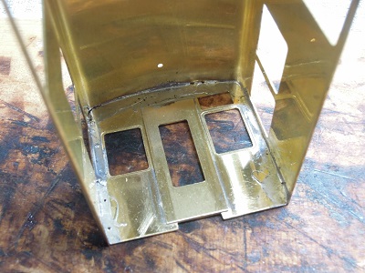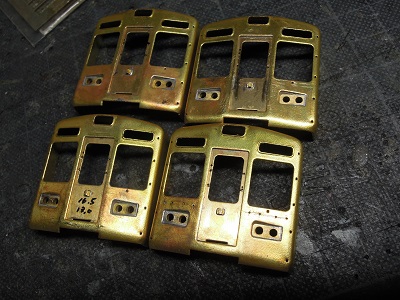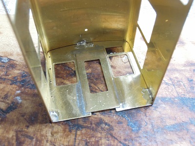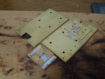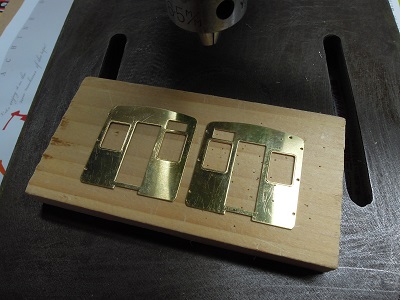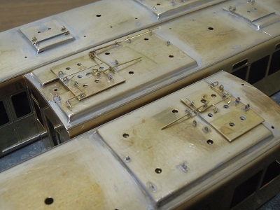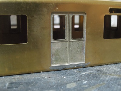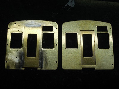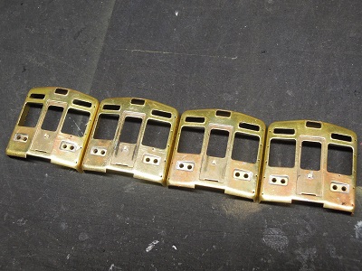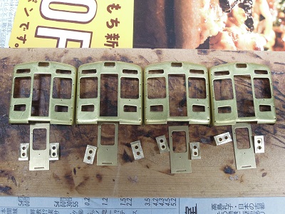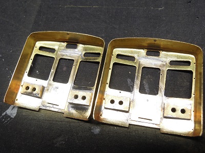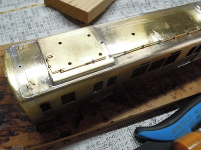 ・前面組立(2015-8/11) 今回、手すり類の穴あけは後からとし、先に貫通ドア類を 半田付けします。 |
