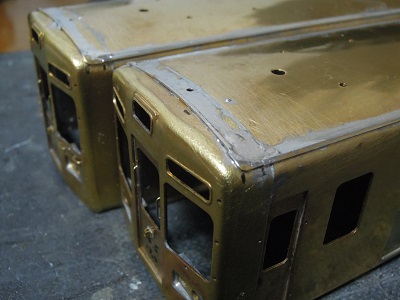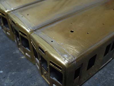 ・車体箱組(全車) 表面から。前面との継ぎ目もパテ代わりに半田を盛り、 はみだした半田は後でキサゲます。 |