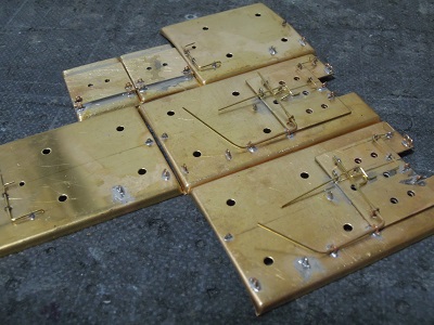・パンタ台組立 写真は梅田寄り前面側パンタ台。こちらも主配管の クリートも併せて半田付けしています。 |