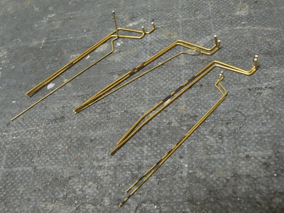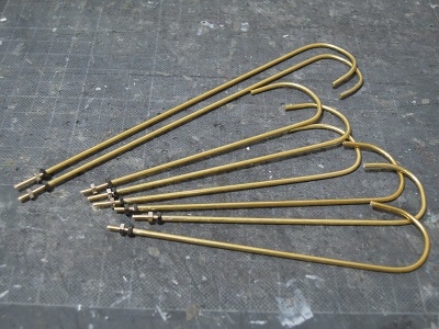 ・パンタ台組立 主配管の末端である配管からケーブルが出ている図を 製作。 外径φ0.6mm,内径0.4mmの真鍮パイプにφ0.4mm真鍮線を 通し、配管止め1クリート分の長さで作成しています。 |