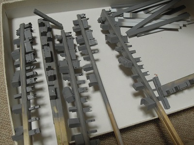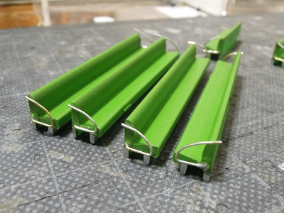 ・雨樋取付 先頭車も同様です。 運転台側は枕木方向の雨樋とコーナー用パーツを 取付けます。 |