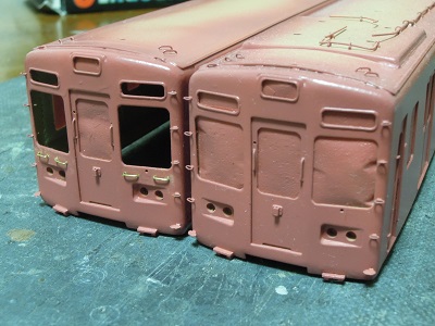 ・車体塗装 車内をマスキングし、車体側の下地として、更に交流用ローズ ピンクを吹いています。 この時7105実車の窓下に転落防止幌取付け台座用の手摺が 実装されていることにが判明。 慌てて取付けます。 |