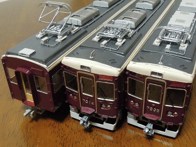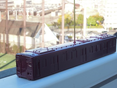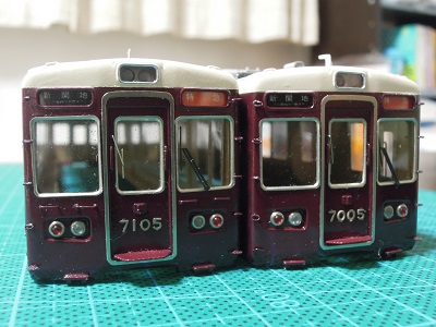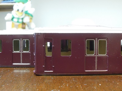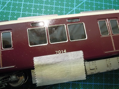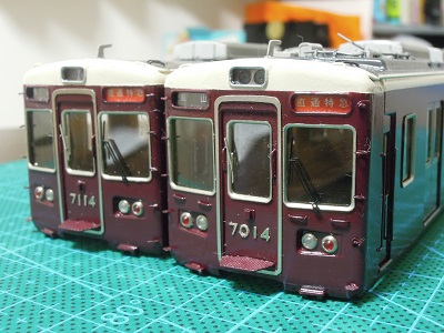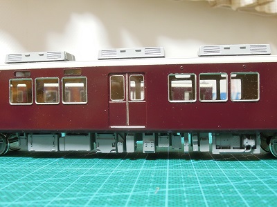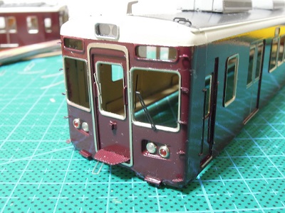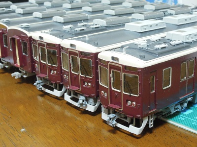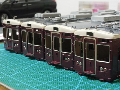 ・車体塗装 屋根は現行の暗めのグレーとします。 マッハのNo.59E:阪急新屋根をベースに黒を追加・調色した ものを吹いています。 |