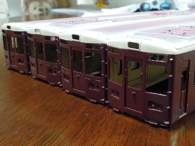 ・車体塗装 マルーン塗装完了。 定番のマッハNO.59B:阪急マルーン新を使用。 今回も薄めに溶いて、5〜6回ぐらい徐々に吹き付けて います。 そのため3日程度要しています。 |