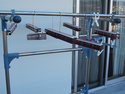 ・車体塗装 磨きだし部の表面処理も兼ねて、仕上げのクリアーを吹付け、 ベランダで乾燥中。 |