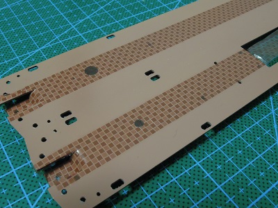 ・床板組立(2015/12/13〜12/26) 更新車の床はブロック模様が施されていますので、 デカールで表現してみました。 |