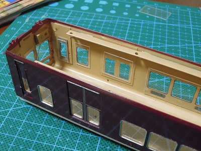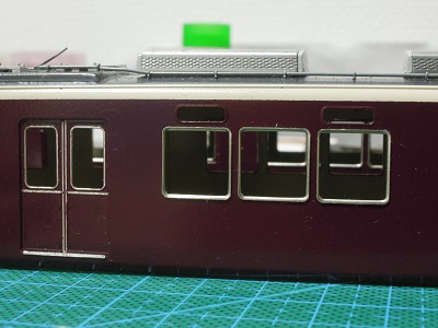 ・車体パーツ実装 窓ガラスパーツはt=0.2mmの透明プラ板から切出します。 |