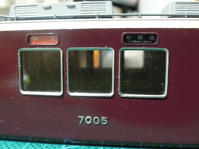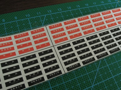 ・方向幕貼付け(2016/1/2) 方向幕はExcelで自作しました。 透明プラ板に接着し,切り出して窓ガラスセルの裏側から 貼り付けます。 |