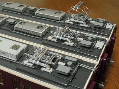 ・車体仮組 パンタ実装。 こちらは梅田寄りパンタグラフ周辺。 |