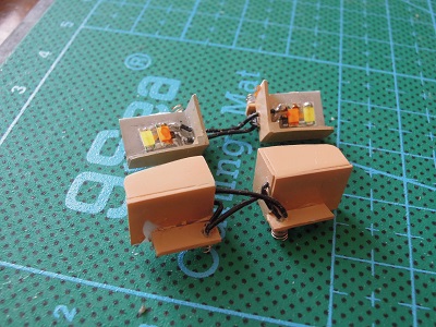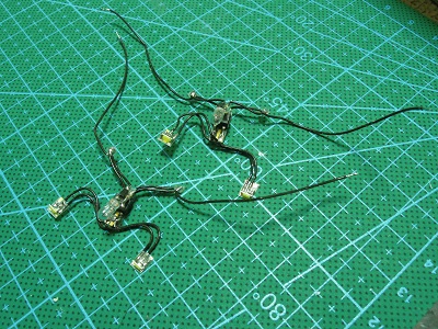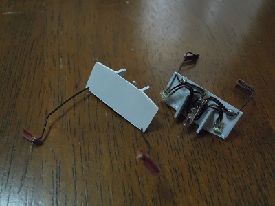 ・ライトユニット類実装その2(2016-4/29〜4/30)) 標識灯・尾灯ユニット...。どのように構成するのが良いか いつも悩みどころです。 今回は車体側に実装を考え、左右で1ユニット化しました。 配線が見えるのが不細工ですが...。 |