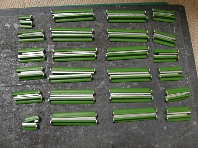 ・室内シート製作 c#7014は従来製作編成と同一仕切りのシートのため、 そのまま生産に。 塗料はGSIクレオスNo..135:ロシアングリーンをベースに若干 オレンジを混ぜたもの(確か...)です。 |