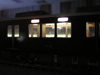 | 先頭車:7019、7119 ・前照灯・尾灯を点灯できるようにしました。 市販のユニバーサル基板に、市販のLED等を使用して自作 しています。 ⇒照明改良工事完了し、後述のようになりました。 |