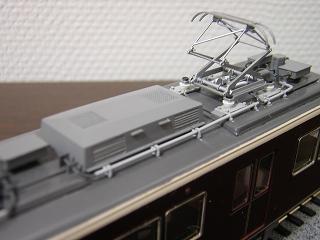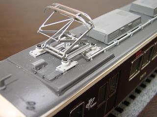 | 中間車:7619 ・屋根上パンタグラフ周辺(梅田寄) 先頭車同様パンタグラフかぎ外し配管はΦ0.4mmの真鍮線、 パンタ母線はΦ0.6mmの精密パイプにΦ0.4mm真鍮線を通した もので表現しています。 |