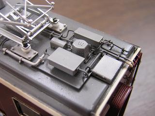| 先頭車:7019 ・屋根上パンタグラフ周辺(神戸寄) 7019編成は7000系の中でも後期に増備された車輌の為、神戸寄り パンタグラフ周辺の屋根上配管が異なっています。 配管はΦ0.6mmの精密パイプにΦ0.4mm真鍮線を通したものと 0.5mm精密パイプに0.3mm真鍮線を通したもの、およびΦ0.4mm 真鍮線で表現しています。 配管止めは、マッハの洋白パーツを使用しています。 |