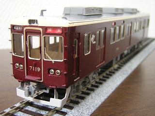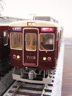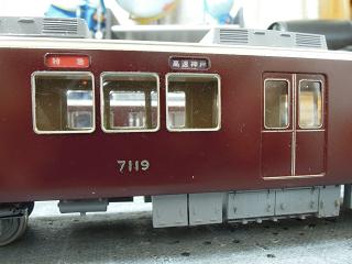 | 先頭車:7119 ・神戸寄先頭電動車。 ワイパーは7019と同様に運転台はエンドウ製、貫通ドアは エコー製を使用、連結器はエンドウのナックルカプラー (自動連結器)を使用しています。 | |