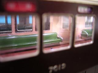 | 中間車:7519 ・全車室内シートを作ってみました。 カツミのプラ製ロングシートを使用し、肘掛部を作りこんでいます。 |