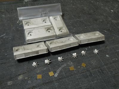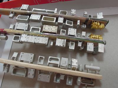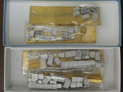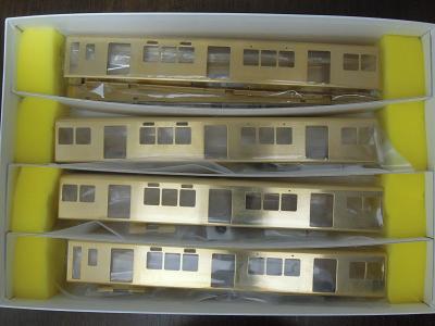 キット内容 ・Aセットには先頭車2両と中間車2両の構成です。 折曲済の側面〜屋根に妻板と、ロストワックス製の 先頭部を組合わせる一般的な構造です。 クーラー、ベンチレータ、配電盤はホワイトメタル、 その他はロストワックス製になっています。 |