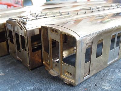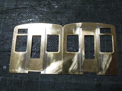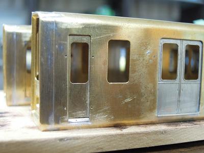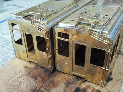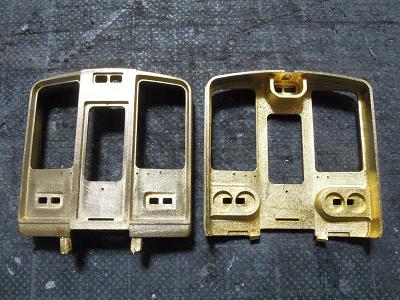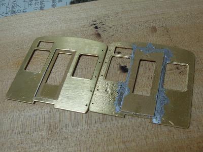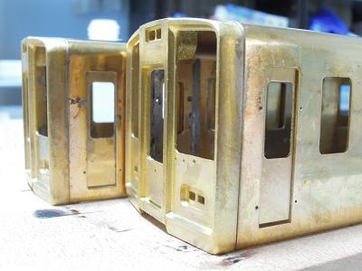 先頭車:箱組み ・前面はロスト製。 半田付けに備え,キサゲ刷毛で擦ってワックス成分を 除去しておきます。 |