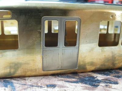 乗務員ドア取付け ・乗務員ドアは手摺取付け用穴位置を併せて半田付け します。 |