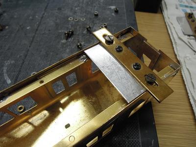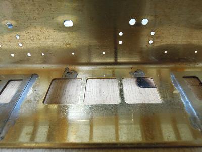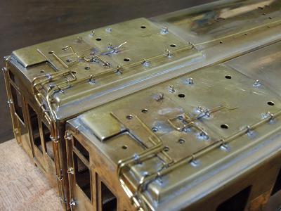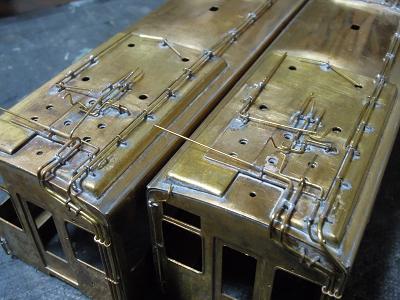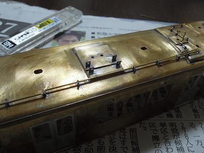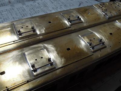 パンタ台実装 ・写真は神戸寄りパンタ台周辺。 キサゲ刷毛と彫刻等で余分なはんだを落としています。 |