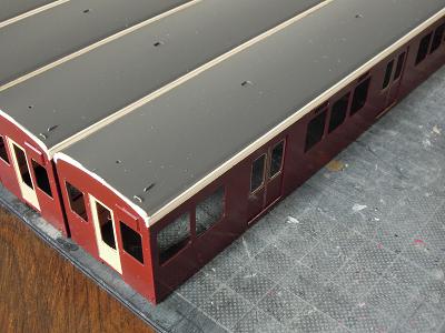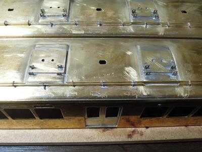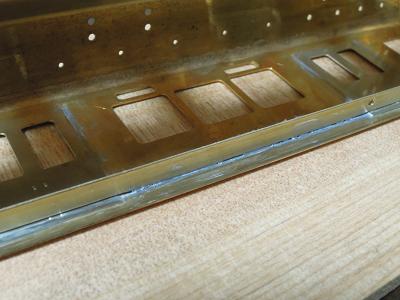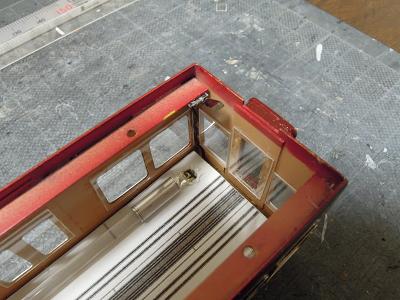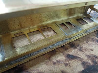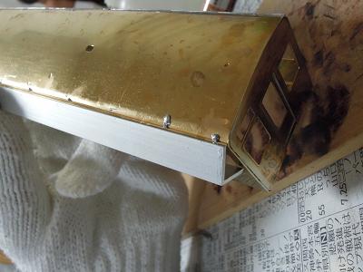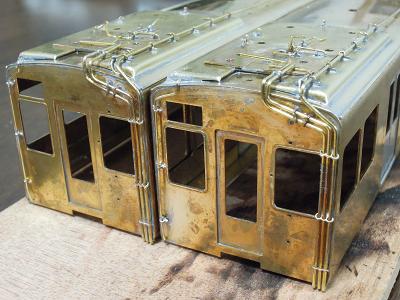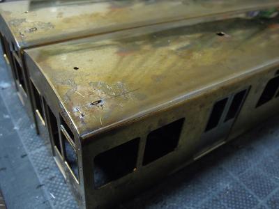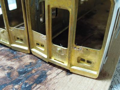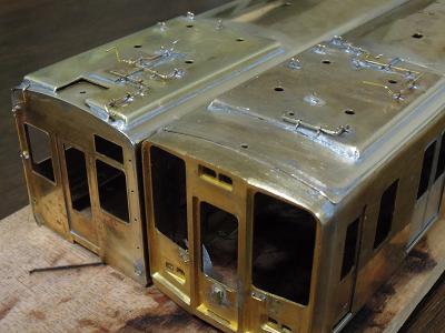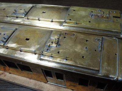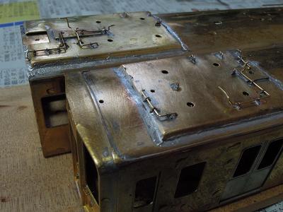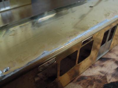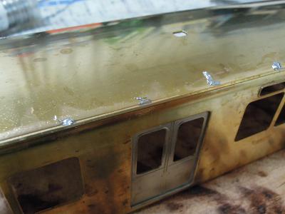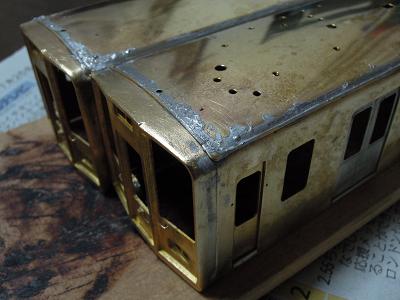 雨樋取付 ・先頭車前面も同様です。 コーナーパーツの取り付けが結構面倒です。 この時点では余分な半田がはみ出ており汚いですが、 後でキサゲ処理により余分な半田を除去します。 |