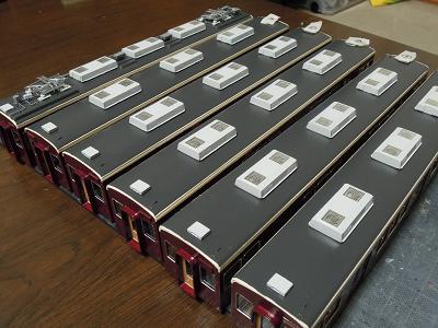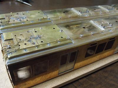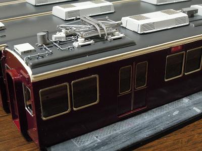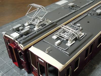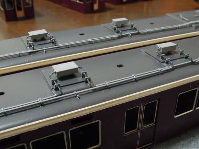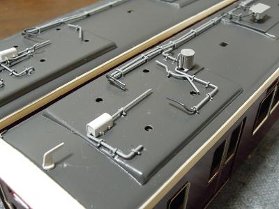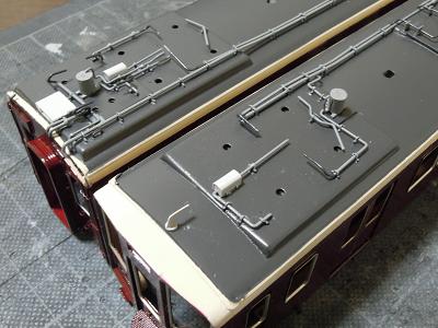 屋根上パーツ取付 ・こちらは梅田寄りパンタ台周辺の俯瞰。 |