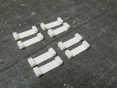 室内シートの製作 ・まずはロングシートから。 両端の肘掛から製作します。 前作の7019F同様、手持ちのt=0.5mmプラ板を2枚貼り 合せたものを切り出しています。 幅は2.5mm、長さは長い方を7mmとしています。 最終的には現物で併せていきます。 |