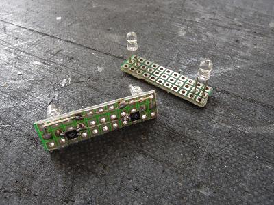 標識・尾灯ユニット製作 ・先に製作したライトケースに併せて、標識・尾灯回路を 製作します。 シール基板に、チップLEDを2個実装し、制限抵抗に 1kΩを使用しています。 集電には余った真鍮線を用いています。 |