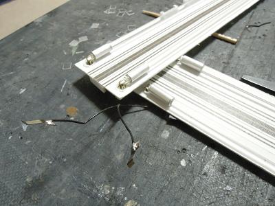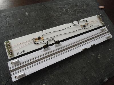 室内灯ユニットの製作 ・導光材の配置 両端のLED間はタミヤの透明プラ棒を配置し、蛍光灯の ようにしています。 LEDとプラ材は,内径Φ3mmのアルミパイプを用いて います。 試作時は,方向幕用LED専用のブリッジダイオードを 設けていましたが、ブリッジダイオードのIfmax=0.5Aで あることから、室内灯と兼用にして、回路を削減しました。 また配線に試作では全てテフロン線を用いていましたが、 加工とはんだ付け性が悪いので、一部を除き、通常の 電線に変更しました。 |