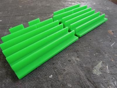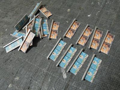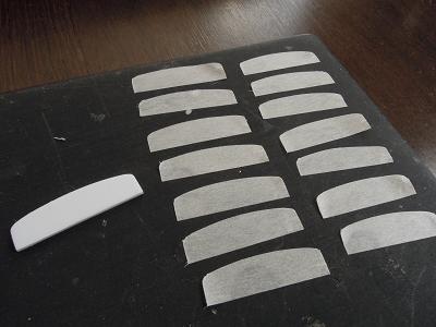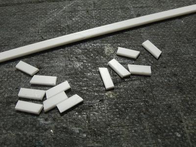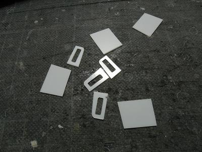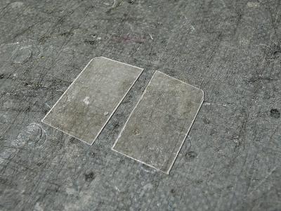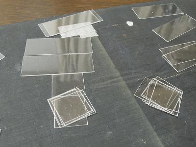 窓ガラスセル貼付け ・8両分、t=0.2mm透明プラ板を切り出します。 |