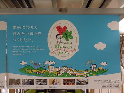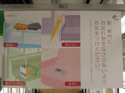 車内吊り広告貼付け ・効果確認で良い感じでしたので、中間車残り6両にも 施しました。 吊り広告の位置、パンタあり車と無し車(ロングシート車 とクロスシート車)で違いがあるのにお気づきでしょうか? |