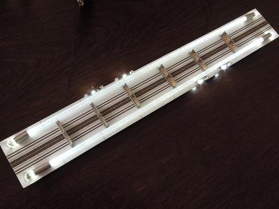 照明ユニット試作 ・7019FではKATOの室内灯ユニットを使用しましたが、 方向幕を光らせたりした結果、かなり暗くなってしまい ました。 ということで、HPで紹介されている”夕庵式”をベースに 阪急っぽくモディファイしてみました。 t=0.5mmプラ板に。天井模様を印刷した紙を貼り付け、 導光材にはΦ3mmの透明プラ丸棒を使用して、両側から LEDで照らすようにしています。 |