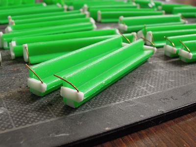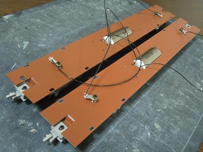 室内灯組込み ・集電用の配線仕上げを行います。 試作的な意味合いもかねて、1両先行。 実物に合わせ、線材の配線長を決め、先端に集電用の 端子をはんだ付けします。 |