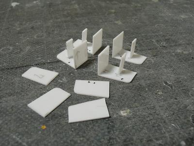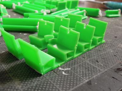 室内シートの製作 ・クロスシートもカツミのパーツをカットして使用して います。 転換シートの2列は枕部が分離されているので、 カッターで切込みを入れています。 |