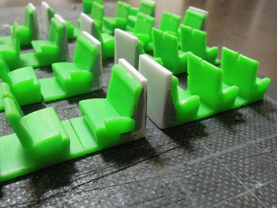 室内シートの製作 ・クロスシートは以下の順で塗装していきます。 @床(マッハ:No.8:パレット貨車) A端部の室内デコラ色 (マッハNo.59F:阪急室内パネル+No.8:パレット貨車) B枕カバー(GM37:白3号+GM4:クリーム4号) Cシートグリーン(同上) |