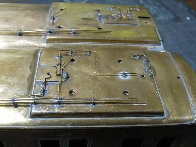 屋根上配管実装2 ・クーラ間ヒューズボックスへの配線を表現します。 配管はΦ0.6mmの真鍮線で、ケーブル配線を Φ0.4mmの真鍮線で表現し、はんだ付けで接続 しています。 クリートで固定されている為、それなりに安定して 表現できると思いましたが、下手くそなので... 嗚呼福原の精密パイプが欲しい...。 |