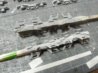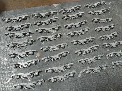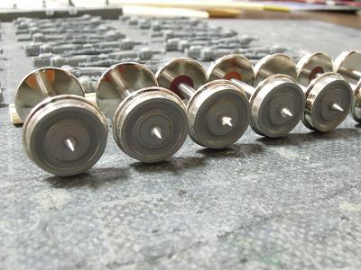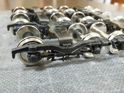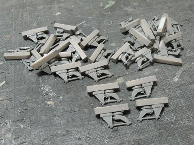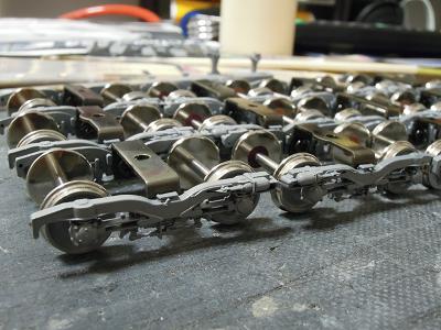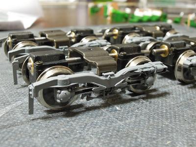 台車周辺塗装 ・台車を一旦分解して塗装に備えます。 まずは台車枠。数が多い(32個)ので難儀です。 |