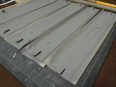 室内シートの製作 ・端部はt=1.2mmのプラ板で表現しています。 隙間は瞬間接着剤とパテを盛って埋めています。 |