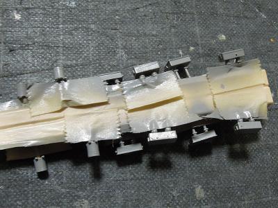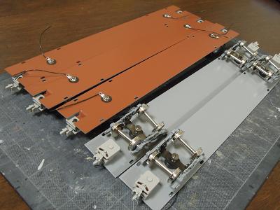 台車枕ばり取付け ・台車の位置に合わせ、枕ばりを接着します。 床板との接着もゴム系接着剤を使用しています。 |