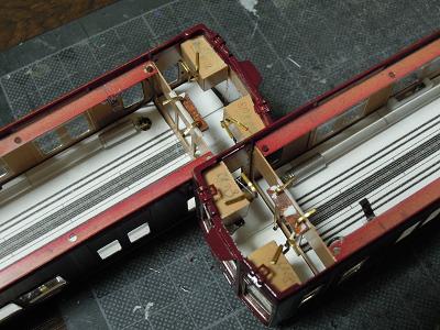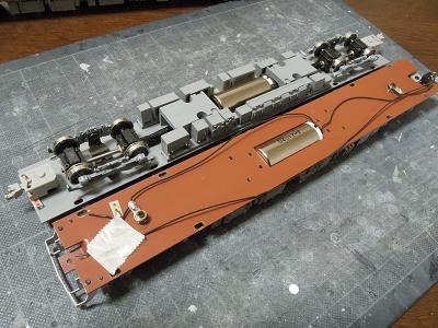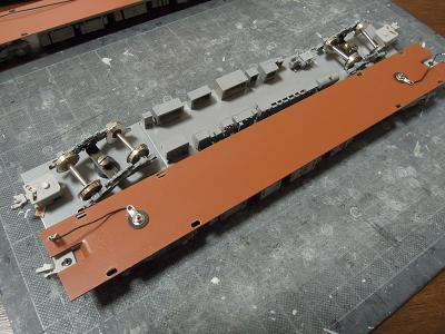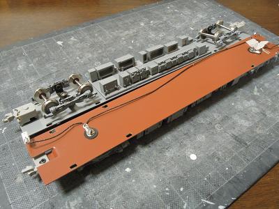 室内灯組込み ・集電端子の接着。 今回配線類が目立たないように車体隅にレイアウトして います。 |