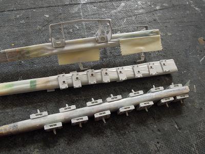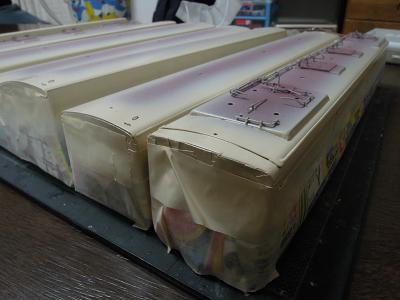 ライトケース類塗装 ・ライト側に遮光用の銀を塗った後、室内パネル色を 吹付けます。 写真は側面方向幕用。 |