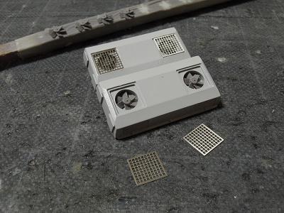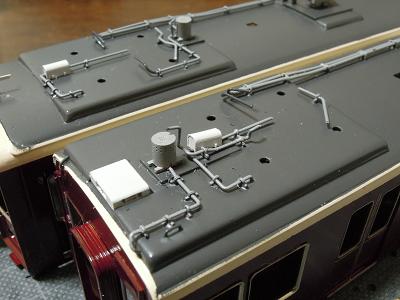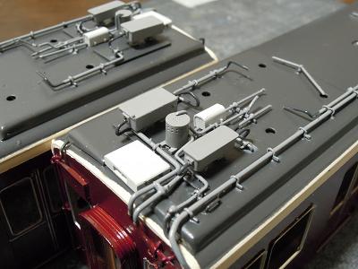 屋根上パーツ取付 ・こちらはパンタ車の神戸寄りヒューズボックス周辺。 |