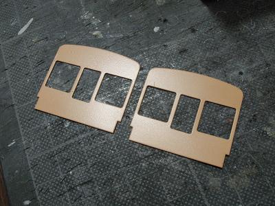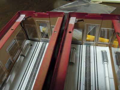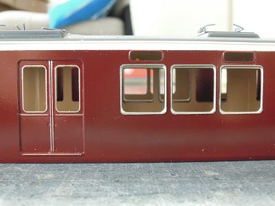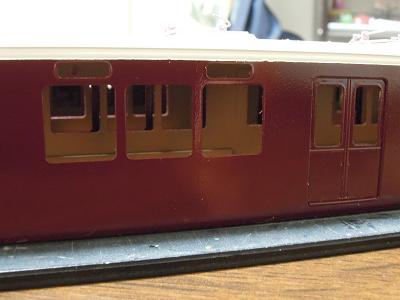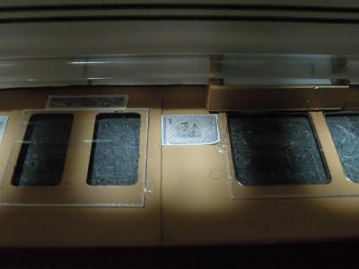 窓枠取付け。 ・前面も同様です。 貼付けたサッシ数、8両で全166個...。 |