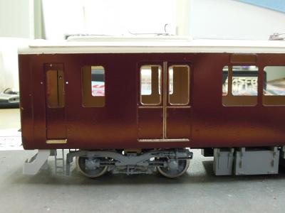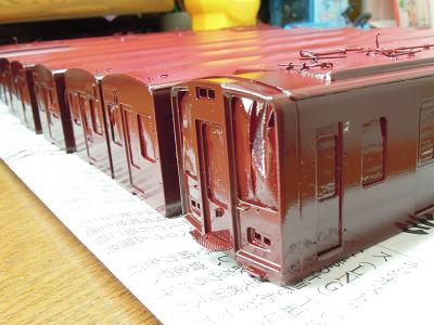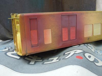 車体塗装 ・リワークは保護クリア塗装と兼ねる為、一旦塗装は終了。 新年運転会を利用して、ドアレールの磨きだしを行います。 これにて一気に阪急らしくなってきます。 この作業によって、誤って塗装を削ったところが数点。 ”ムンクの叫び”状態が数箇所...。 リワーク実施後、クリアを吹く予定です。 |