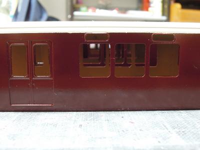 車体塗装 ・実車の図面を見ていると、方向幕上縁から塗り分け線まで 模型寸法で0.5mmほどあるはずですが、このキットでは塗分 高さを図面寸法にあわせると、方向幕上縁のところに来て しまいます。 アイボリーをマスキングして、マルーンを吹いてリワーク することになりそうです。 |