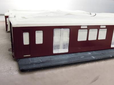 屋根塗装 ・まずはマッハ59E:阪急電鉄新屋根を吹いてみました。 塗料缶で見る限り黒に近いイメージでしたが、カツミの 8000系と比べるとかなり明るめです。 |