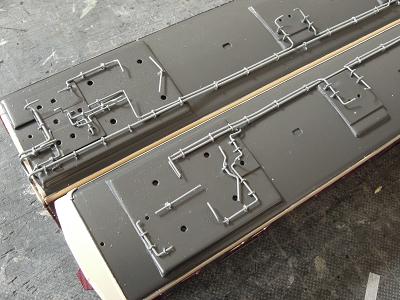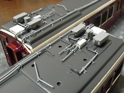 屋根上配管実装1 ・梅田寄りパンタ側の主配管の状態。 2本ともパンタグラフに接続されますが、この管から 電線が出ている表現方法を思案中です。 |
