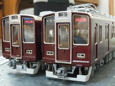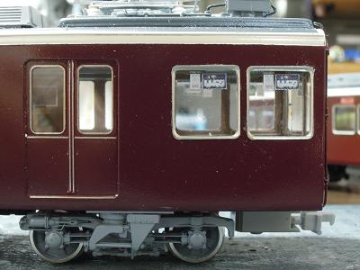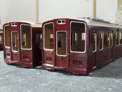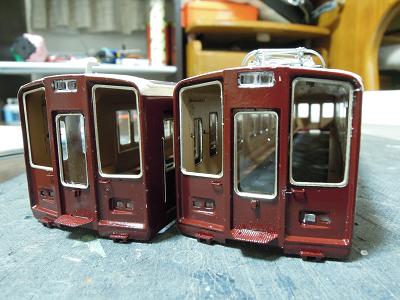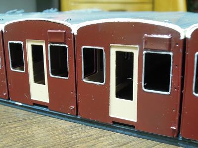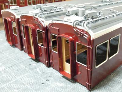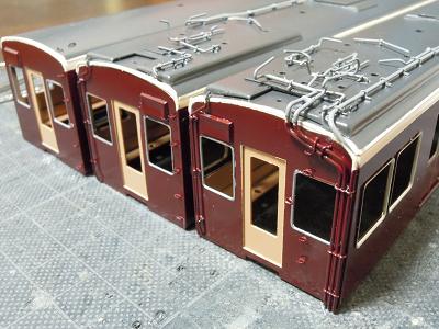 窓枠取付け。 ・全車接着完了。 これにて一気に阪急電車っぽくなります。 阪急電車は、自作を企んでもこのサッシ表現が難関で、 このパーツが手軽に入手できれば良いですが...。 |